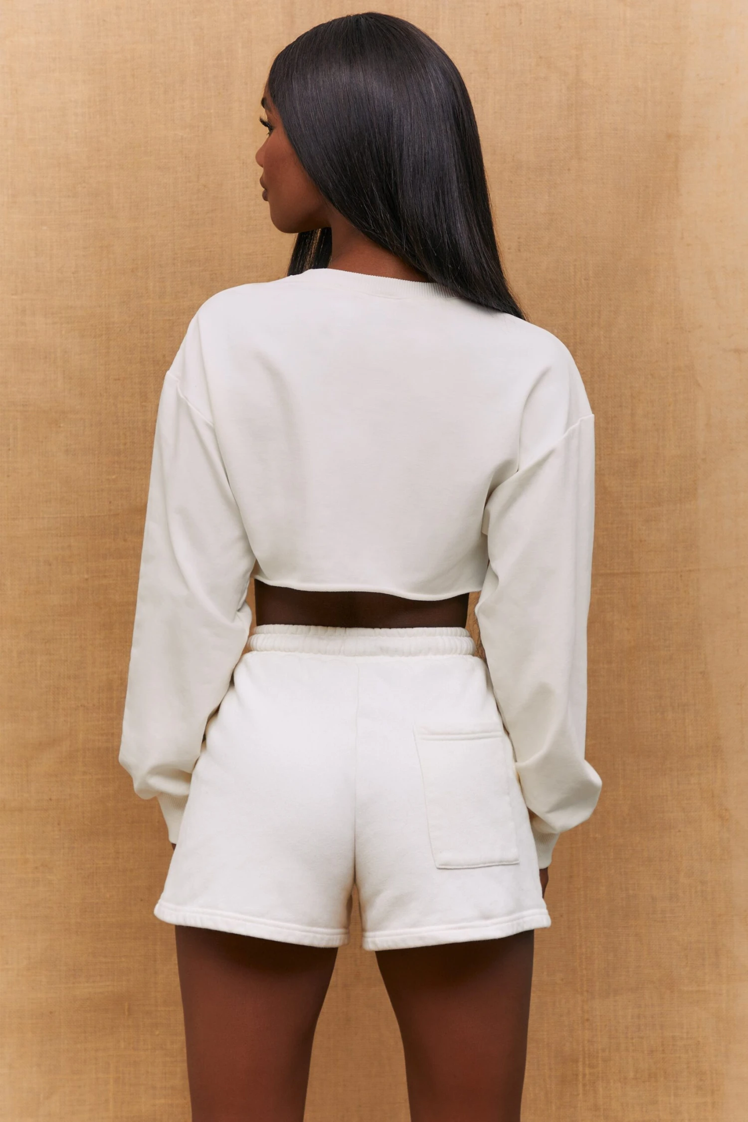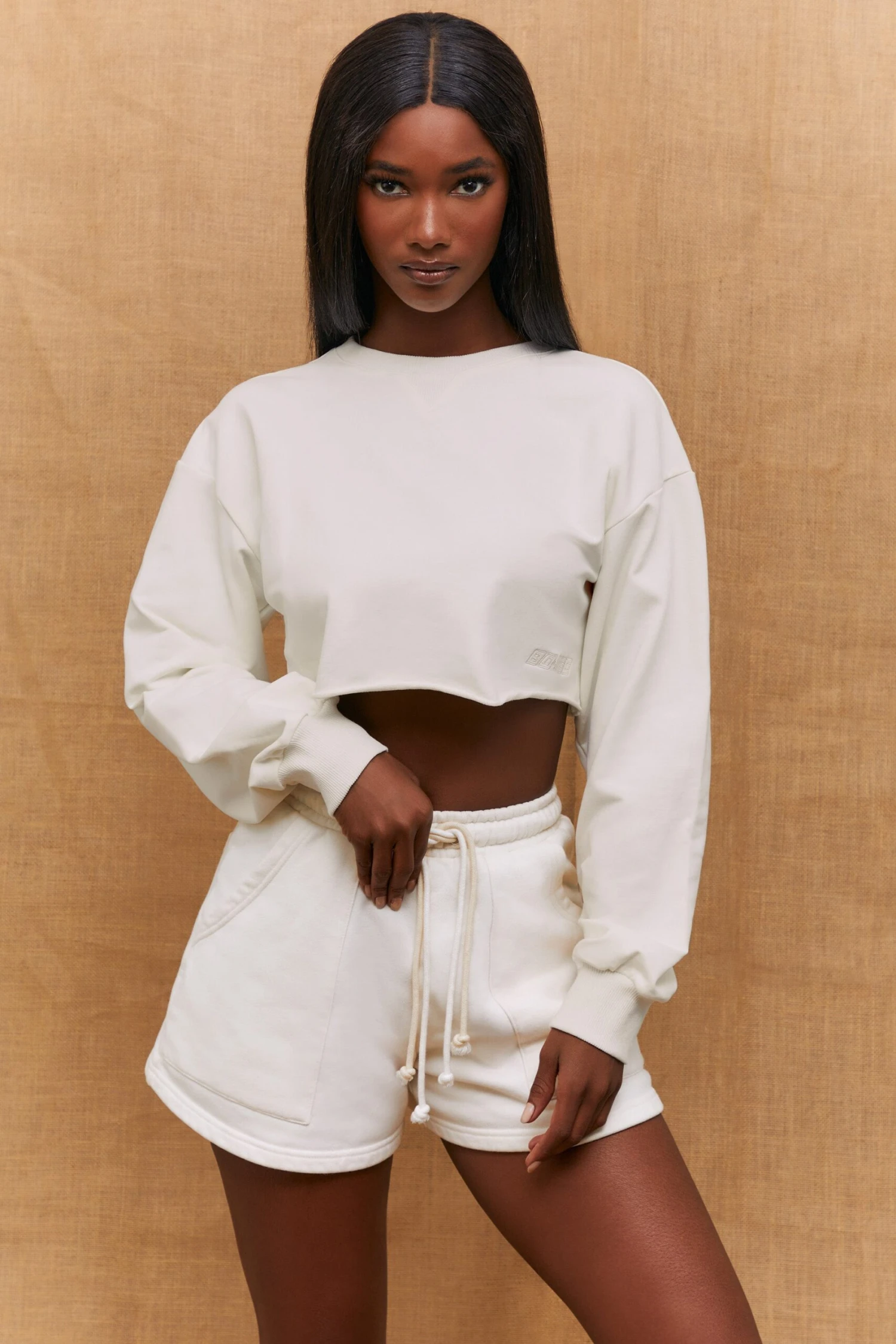 Soft, comfy and relaxed, our all new cropped sweatshirt is a must for keeping it casual on rest day. Featuring a round neckline, long cuffed sleeves and a raw hem, our crop sweat top is finished in cotton sweat fabric for the ultimate athleisure aesthetic. In a subtle oversized fit with stitched Bo+Tee branding on the side, mix and match this ivory jumper with joggers, leggings or shorts and discover your new confidence.